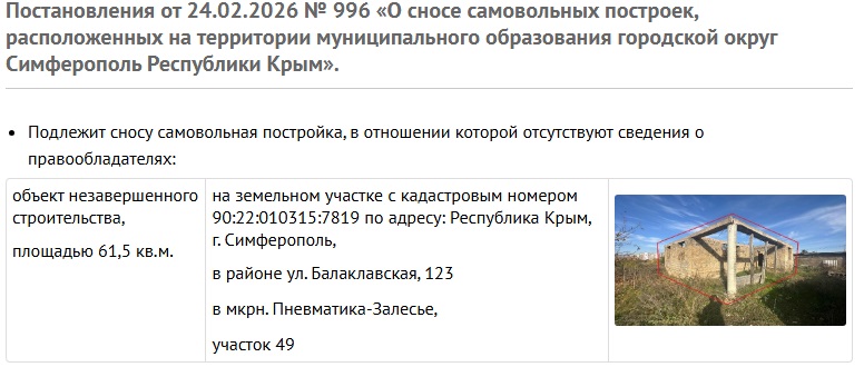 Решение принято по истечению установленного срока для сноса самовольных построек - 3 месяца со дня размещения сообщения о планируемом сносе самовольной постройки на официальном сайте администрации города Симферополя. Строение размещено по адресу - в районе ул. Балаклавская, 123 в мкрн. Пневматика-Залесье, участок 49. |