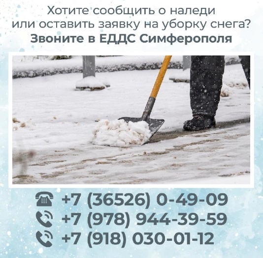 Обращения по вопросам уборки дорог и тротуаров от снега и наледи можно направлять в Единую дежурно-диспетчерскую службу в Республике Крым по номеру 112 или в региональную ЕДДС по номерам телефон спецслужб.