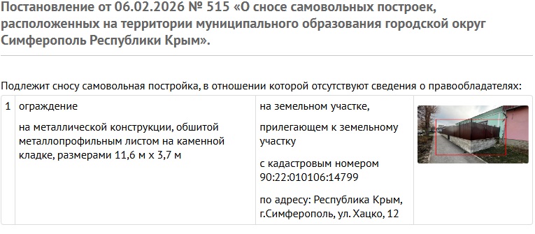 Такое решение связано в связи с отсутствием сведения о правообладателях. Металлическое ограждение расположено около земельного участка. «Установленный срок для сноса самовольных построек - 3 месяца со дня размещения сообщения о планируемом сносе самовольной постройки на официальном сайте администрации города Симферополя», - пояснили в мэрии. |