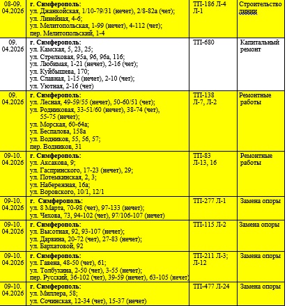 Жители 15 улиц Симферополя 9 и 10 апреля проведут без света Двухдневное отключение света запланировано у потребителей по адресам на 15 улицах Симферополя. В эти 08-04-2026 18:43