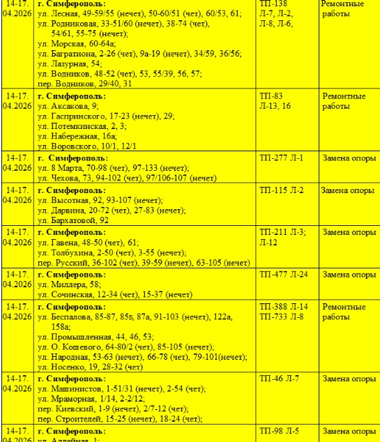 Жители более 40 улиц Симферополя четыре дня проведут без света Масштабные работы на электросетях запланировали специалисты «Крымэнерго». 09-04-2026 17:28